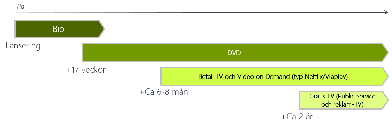 Så här ser en normal process ut för att få ut en film på marknaden. Först ska filmen dra in pengarna på bio. Efter 17 veckor släpps filmen på DVD. Efter ytterligare 2-3 månader släpps filmen till betalkanaler och ca 2 år efter att filmen gick upp på bio visas den i gratis-TV (reklam-TV och Public service). Hur den går på bio sätter prislappen på vad distributionsrättigheterna ska kosta i de efterkommande kanalerna.